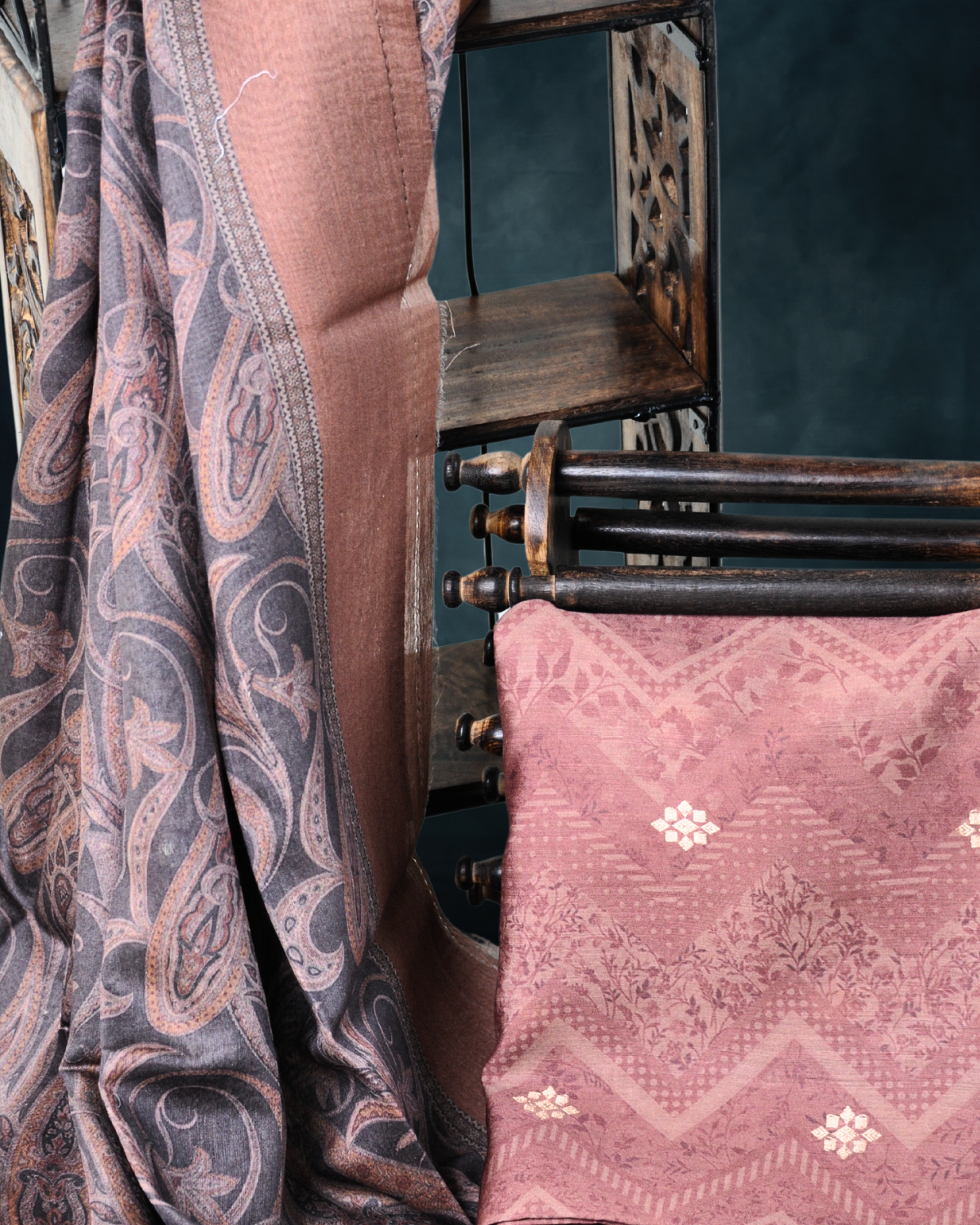 Light rust handwoven monga silk suit with mauve self motifs and paisley dupatta