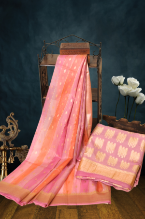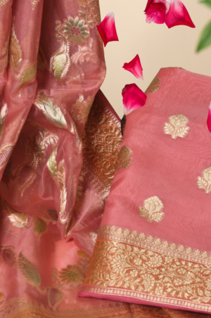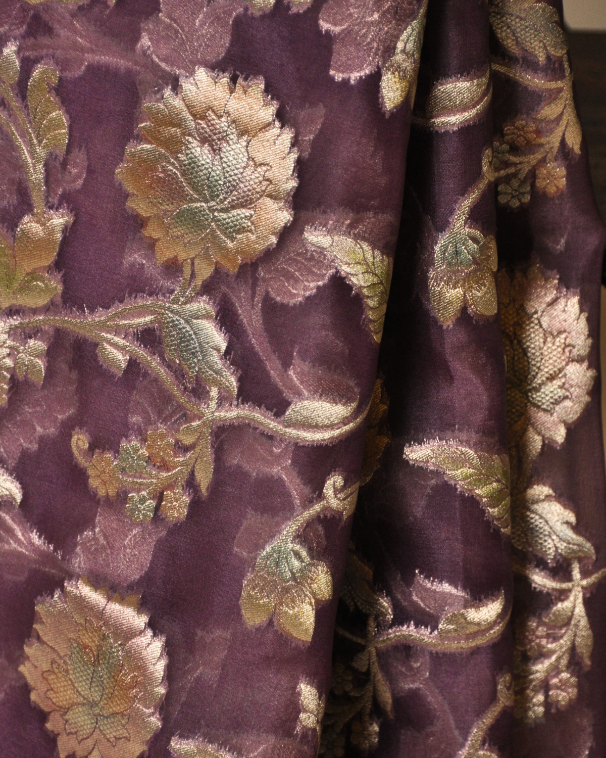 Deep purple bananasi handwoven silk organza suit with delicate motifs on the shirt and an intricate floral jaal pattern on the dupatta